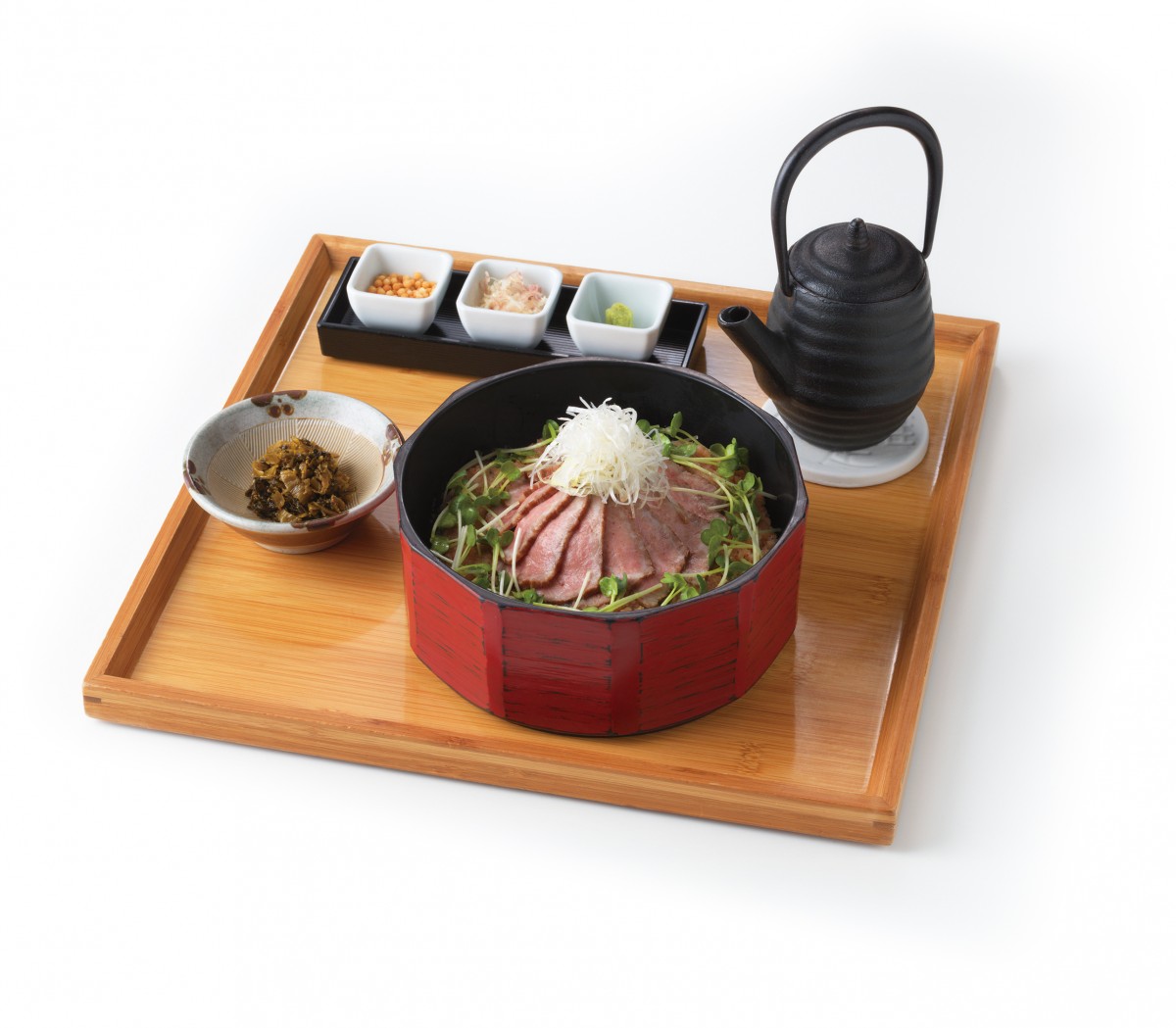 柔らかな肉質と濃厚な旨みが特徴の博多和牛を、あごだしのきいた漬けだれに漬け込んでローストビーフに仕上げました。プチプチとした食感のめんたいこや、温泉玉子と一緒に召し上がったり、〆にはだし茶漬けなど、贅沢な味わいを三通りでお楽しみいただけます。