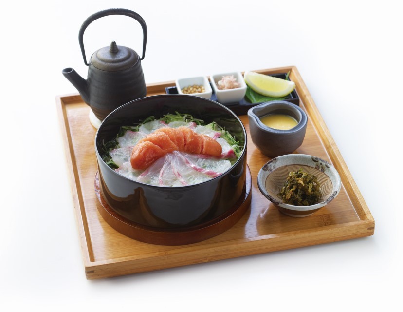 椒房庵の看板である「あごだしめんたいこ」と、鯛のお刺身を贅沢に使った一品です。釜炊きのご飯にのせ、レモンや、卵黄だしとろろ、茅乃舎だしを使っただし茶漬けなど、三通りの食べ方でお楽しみいただけます。