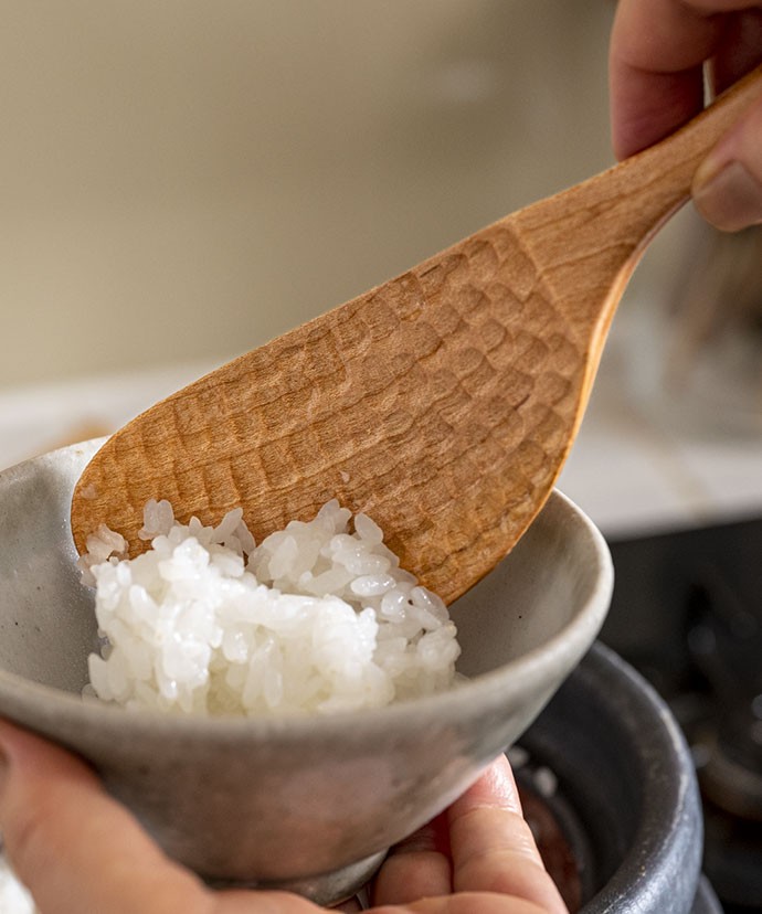 炊きたてのご飯を、やさしくほぐす。お茶碗によそって、みんなでいただく。日々、繰り返す何気ない動作のそばに、お気に入りの道具があったなら。そんな想いをこめて、福岡・糸島にある工房 雲とともに考え、つくった杓文字です。