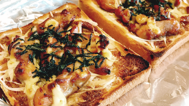 - 食パンに玉ねぎ、照り焼きチキンをのせて、あごだしてりたれとマヨネーズをかける。