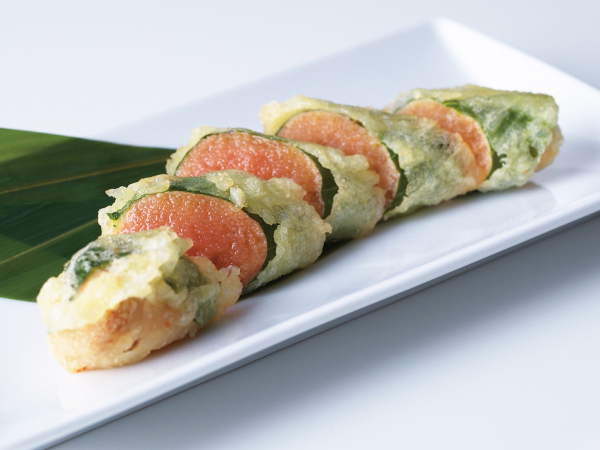 人気の「あごだしめんたいこ」を大葉で包み、天ぷらに。粒感を楽しめるよう、レアに仕上げました。