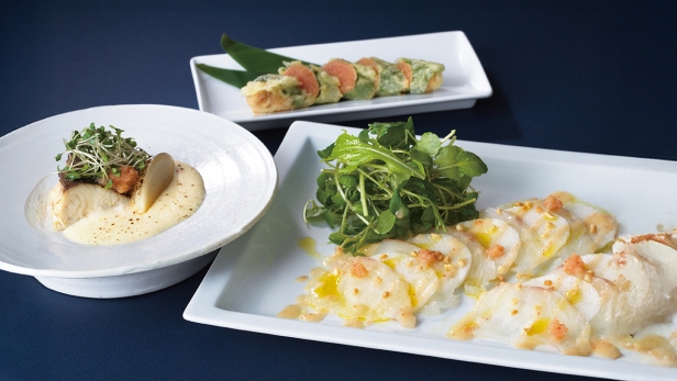めんたいこソースのカルパッチョ。オリーブオイルとナッツで、香りと食感も楽しめます。