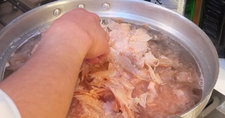 一晩水に浸して出した昆布に、鰹節を加えると、旨味の二重奏ともいえる口の中に広がる奥深い出汁ができあがります。