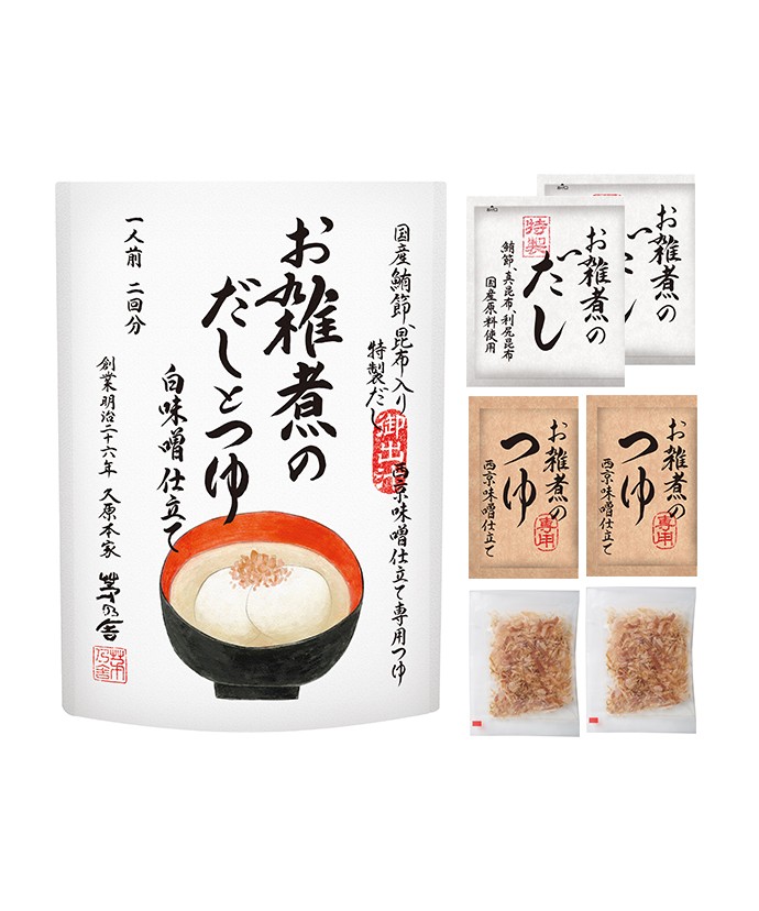 昆布のうまみが生きた「特製だし」と西京味噌使用の「専用つゆ」でつくるお雑煮の素。白味噌が溶けた上品な甘みのつゆは、だしの香りも豊かです。