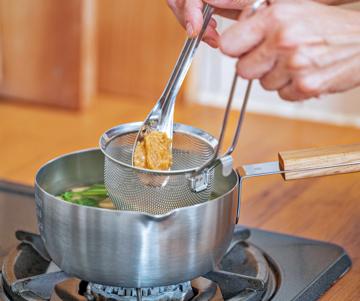 普段何気なくつくっているお味噌汁。味噌漉しを使えば口当たりが滑らかになり、 もっとおいしく感じられます。目詰まりしにくくお手入れしやすいパンチングの穴は 茅乃舎の味噌をはじめ、粒感のある麦みそにちょうどいい大きさにこだわりました。味噌の溶け具合にこだわった漉し網と穴あきスプーンのセットで、調理もスムーズです。
