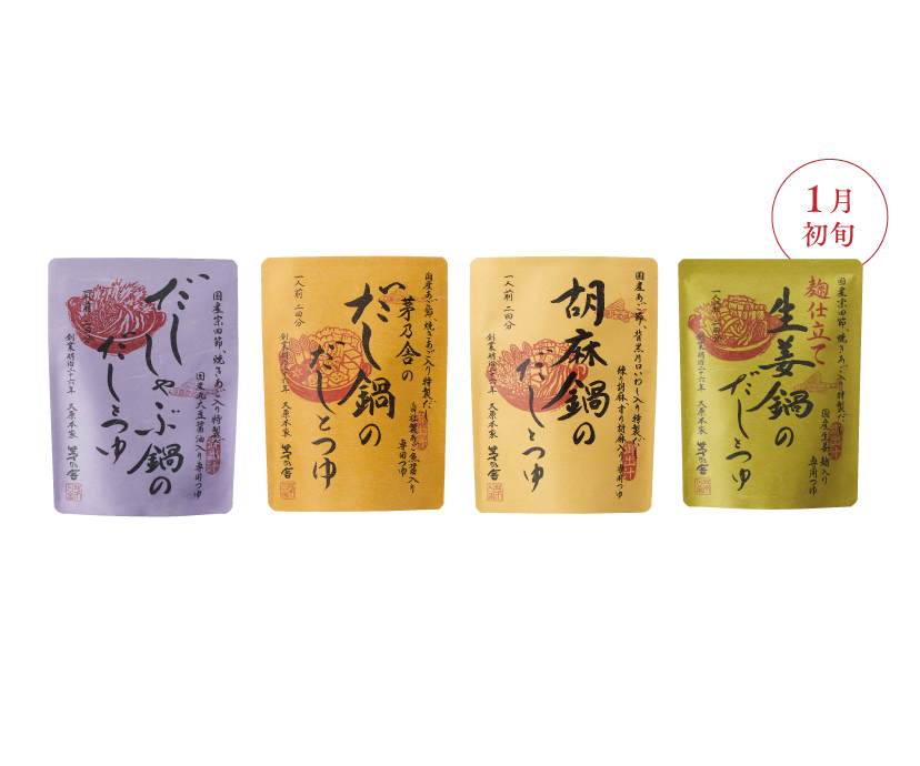 毎年好評の、茅乃舎の鍋シリーズを今年もご用意いたしました。茅乃舎の鍋シリーズは、だしとつゆが別々になっているのが最大の特徴。だしの風味をしっかり引き立たせることで、うまみあるスープがご家庭でもつくれます。