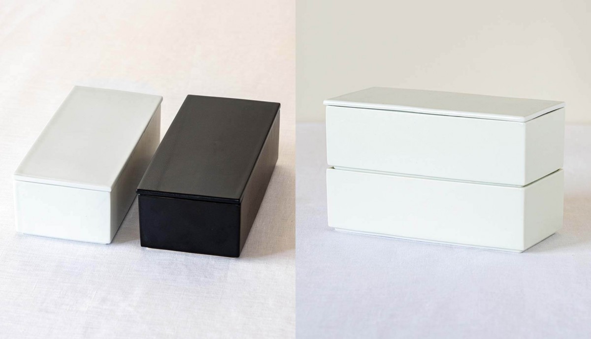 盛付けやすい形で、一人前のおせちのほか複数使ってお重代わりにもなる陶箱です。おつまみやお菓子を盛っても品よく見え、年末年始の食卓に最適。白磁は佐賀・伊万里、鉄黒は佐賀・有田の窯元がそれぞれの得意をいかし、作陶してくださいました。