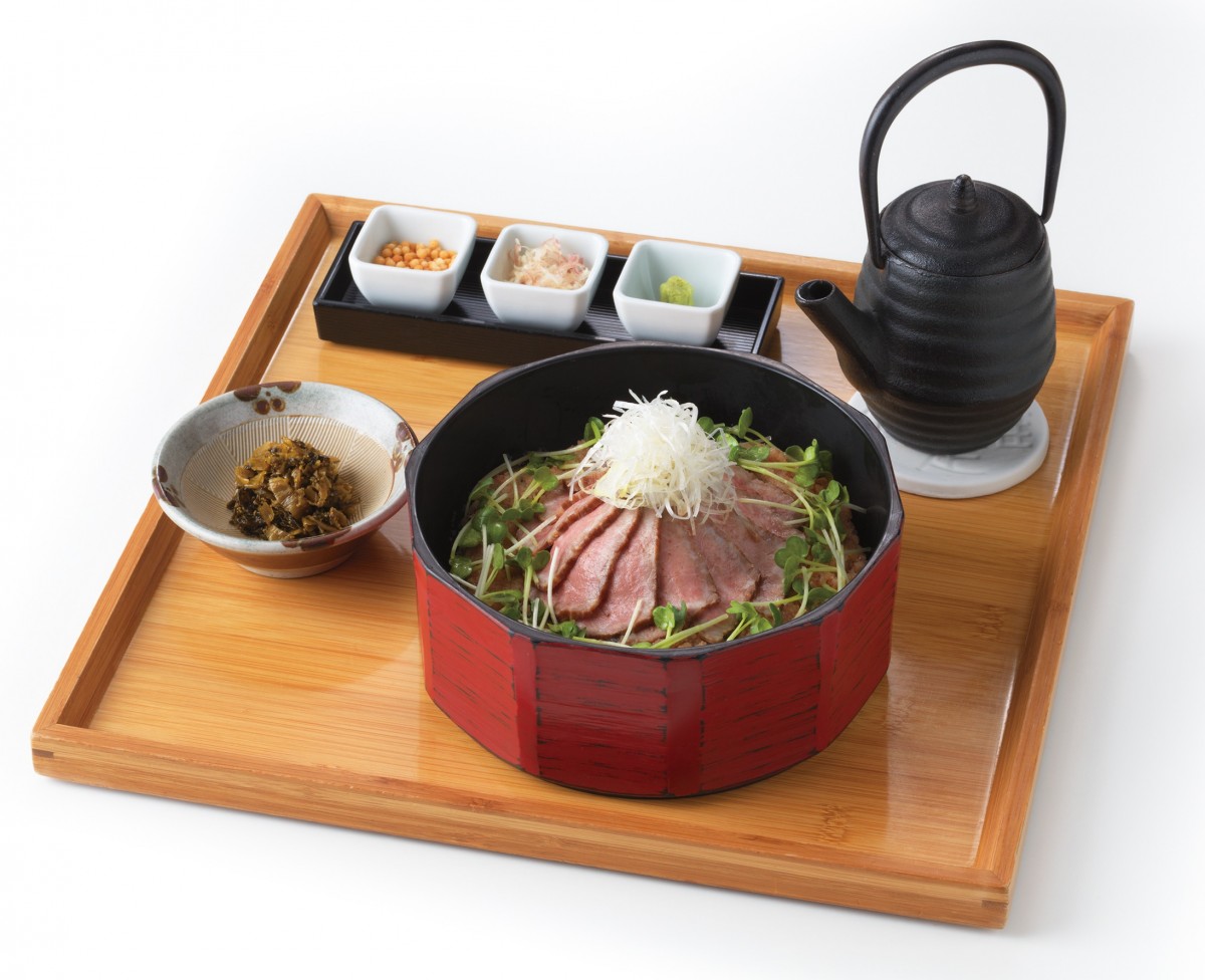 丁寧に育てられた博多和牛は、やわらかな肉質と濃厚なうまみが特徴。その博多和牛を、 あごだしのきいたつけだれに漬け込んで特別なロー ストビーフに仕上げました。口に入れれば、じゅわっとあふれるうまみと肉汁。めんたいこ、 白髪ねぎ、かいわれ大根と合わせ てお召し上がりくださ い。一 度で三通りの味わいがお楽しみいただけるよう温泉卵やおだしもご用意しました。