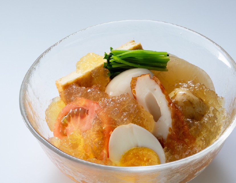冷やしおでんは、だしを活かした特製のジュレが、具材のうまみをさらに引き立てます。